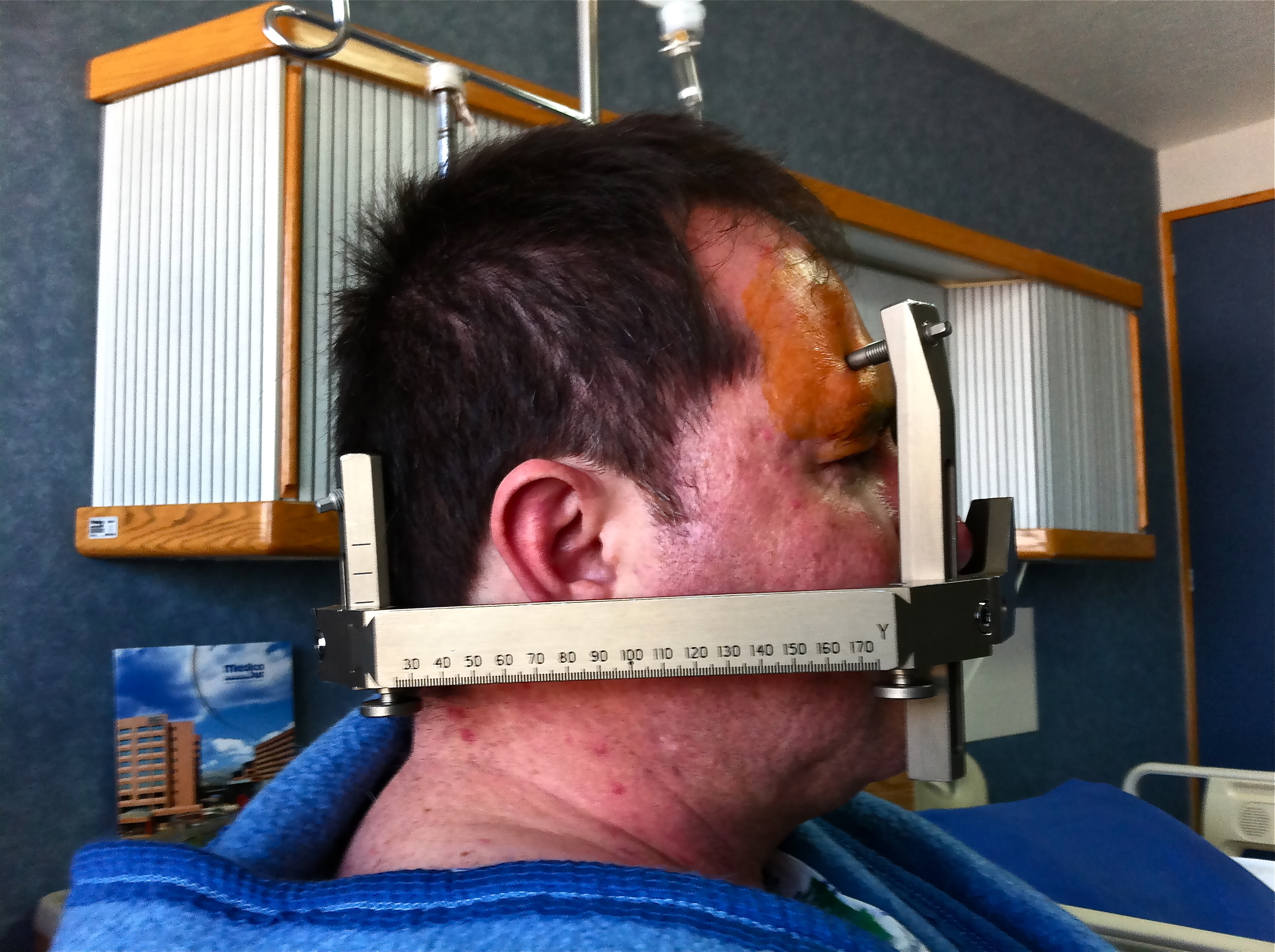 Dicha estructura fijada en mi cabeza, fue “ensamblada”, a la vez, en otra estructura dentro de la plancha, donde me introdujeron, para suministrarme los rayos Gama directo en el lugar donde se encontraba el tumor, es decir, el área de la hipófisis.