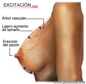 que corre por los tejidos. A través de la excitación los hombres presentan la erección del pene. En las mujeres, se hinchan los labios vaginales y el clítoris, aumenta la lubricación vaginal, el tamaño de los senos y se endurecen los pezones.