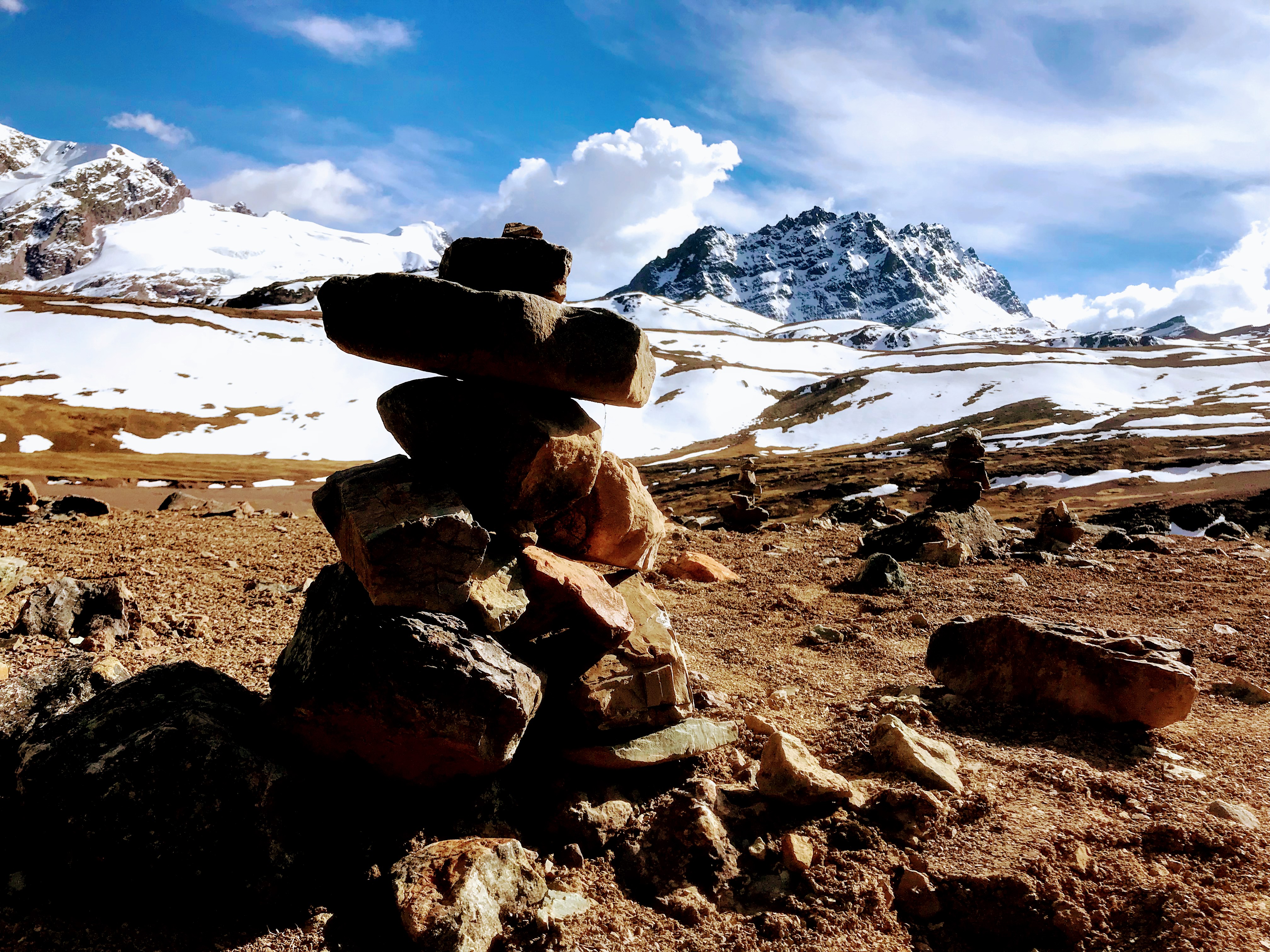 Yo observé entre todos los montículos ahí presentes y elegí uno. Me acerqué, miré mi piedra primero, luego el montículo y después todo el paisaje que nos envolvía. Sentía el aire frío, el cansancio de todos los músculos, las emociones en mi pecho… Sentí también la tierra bajo mis pies sosteniéndome y a toda la cadena de montañas cobijándome… en mi pecho empecé a sentir una gran emoción, sentía como, en realidad, la tierra, la Pachamama me brindaba su protección… le agradecí por todo lo que me había regalado en mis 56 años de vida… empezando por la vida misma y por la oportunidad de estar ahí, en ese maravilloso lugar… después, como si se tratara de un niño herido y con miedo que se acerca a su madre pidiéndole ayuda y consuelo, le pedí a la Madre Tierra que tomara mi dolor y mis miedos y me liberara de ellos dándome a cambio serenidad, paz, amor, confianza…