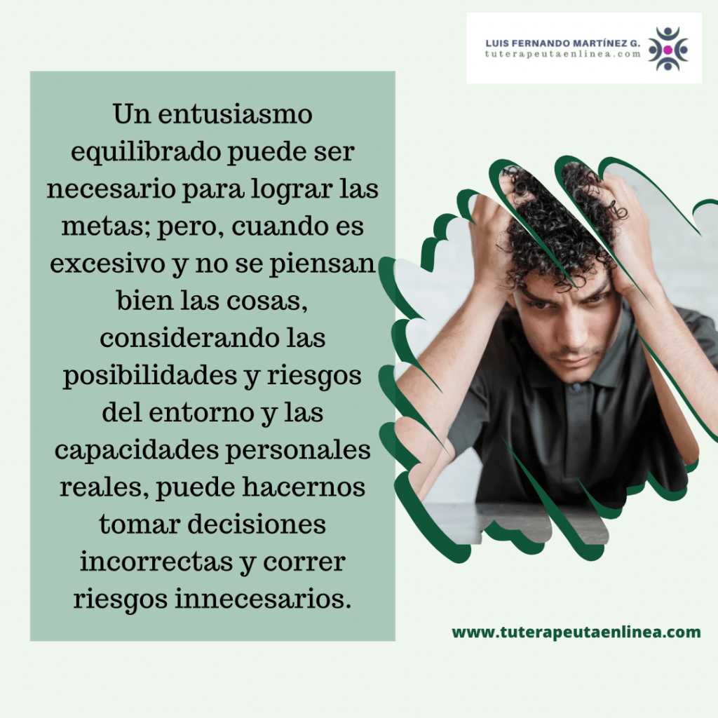 Por otro lado, una persona puede estar entusiasmada con su trabajo, incluso si es desafiante, porque disfruta de lo que hace y se siente realizada, pero también si es excesivamente entusiasta y deja de ver los riesgos lo puede conducir a la toma de decisiones imprudentes. Como vemos, en ambos casos la clave es ser realistas.