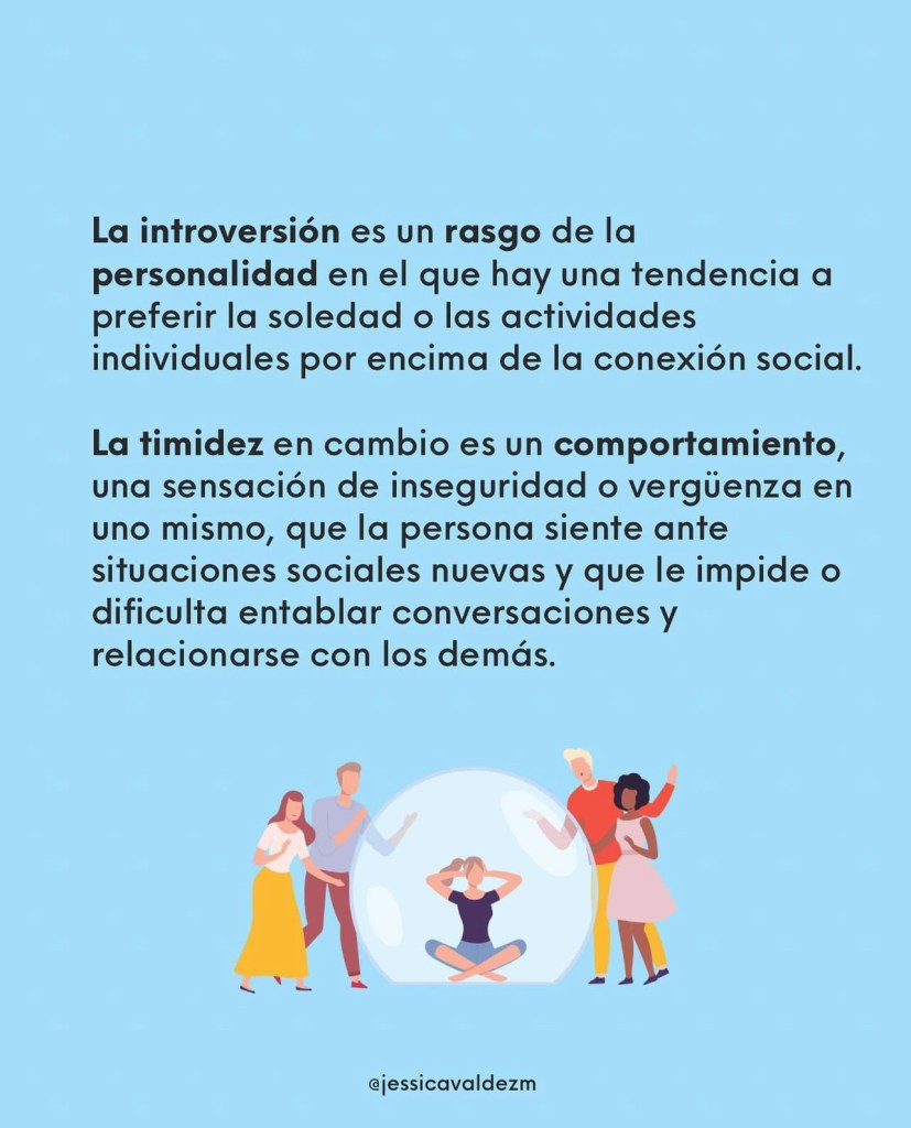 Aunque a menudo se confundieron, timidez e introversión no son lo mismo. La introversión es un rasgo de personalidad biológico que implica preferir ambientes tranquilos o estar más cómodo en actividades en solitario, sin que necesariamente haya miedo o ansiedad social. Por otro lado, la timidez está relacionada con el miedo o ansiedad a ser evaluado negativamente, lo que puede limitar las interacciones sociales porque la persona teme el rechazo o el juicio. Mientras un introvertido puede sentirse cómodo y disfrutar de encuentros sociales selectivos, el tímido puede desear más contacto social pero sentir bloqueo al intentarlo.