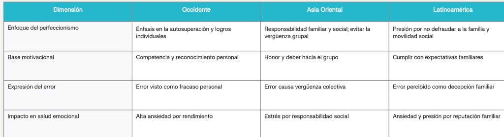 Estas diferencias muestran cómo los valores culturales influyen en la percepción, expresión y gestión del perfeccionismo, afectando la salud mental y la forma en que cada cultura enfrenta sus desafíos internos. La comprensión intercultural ayuda a reconocer que no hay un único modo de vivir o superar el perfeccionismo, sino que varía según el contexto social y cultural en que se inscribe cada persona.